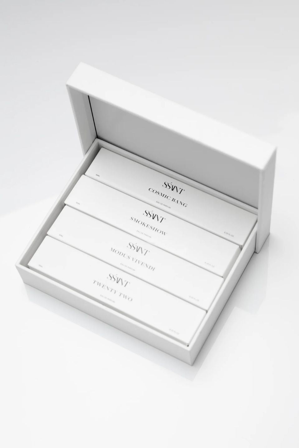 Each set contains four 10ml bottles; Cosmic Bang, Twenty Two, Smokeshow & Modus Vivendi. Allowing you to experience all four Signature SŚAINT scents.