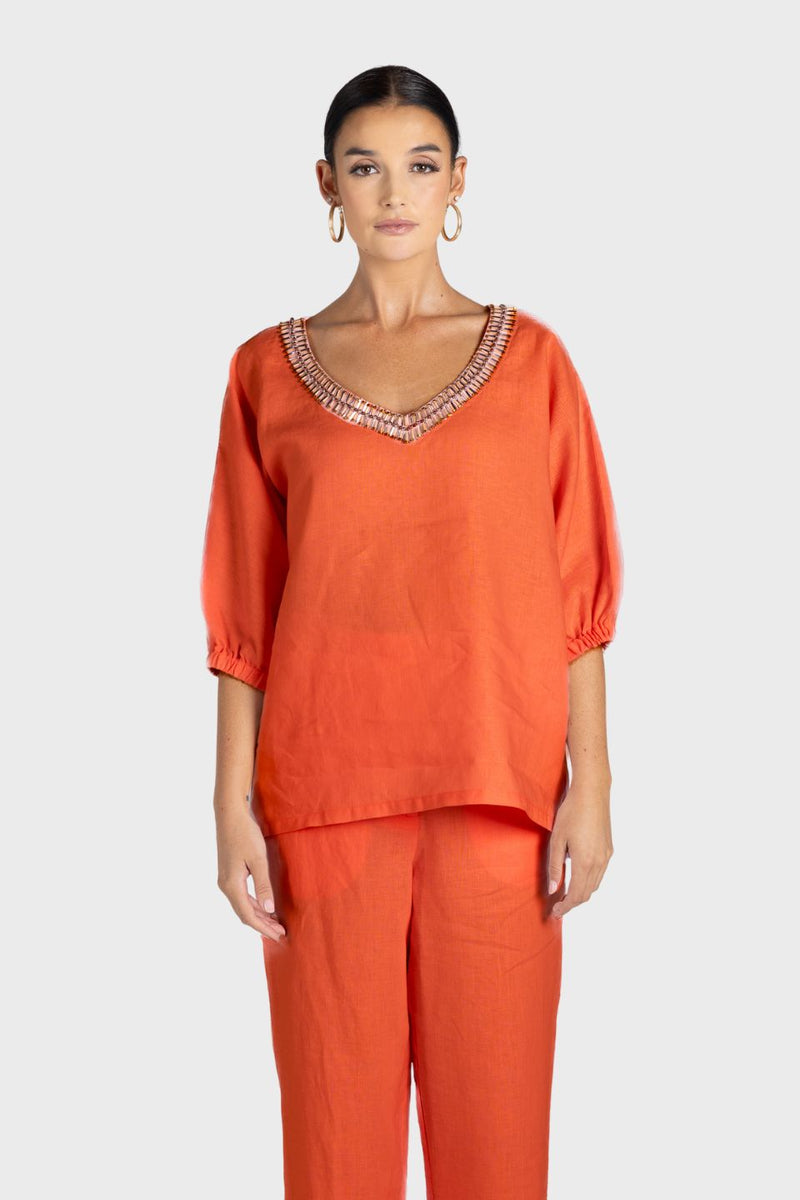 Two-T's Linen V-Neck Beaded Top