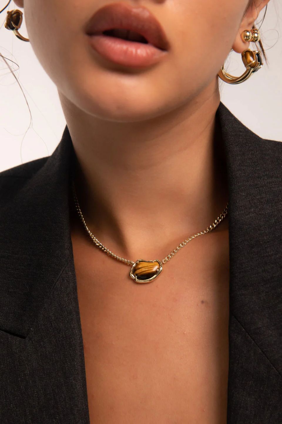The Bean Gemstone Chain Choker is an easy way to add tonal colour to your styling with a custom-cut cabochon tiger's eye gemstone suspended from a classic curb chain.
