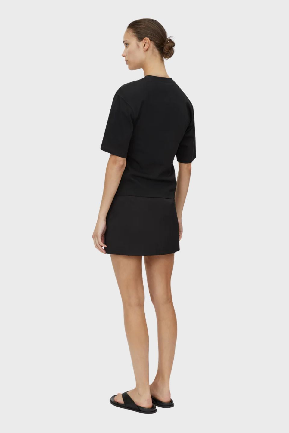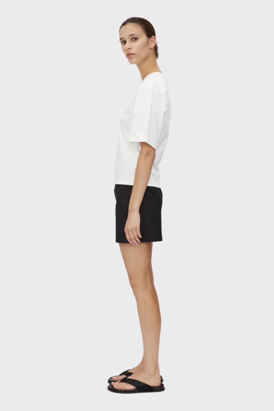 CAMILLA AND MARC Hirst black or soft white short-sleeve t-shirt with strong shoulders and a fitted waist. Ribbed crew neckline.