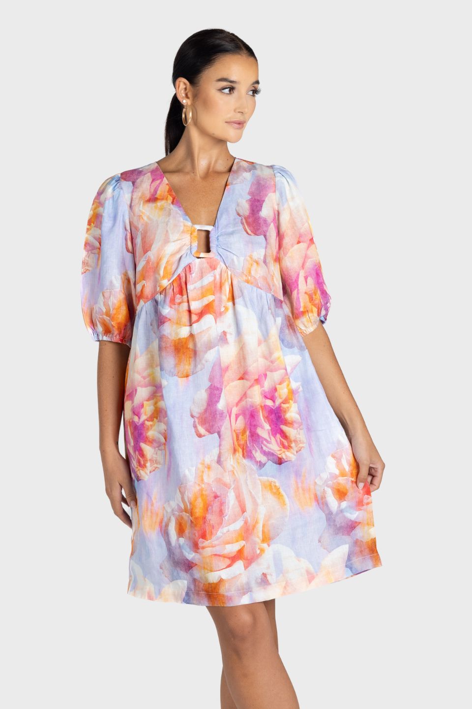This elegant Angelina Short Dress features a flattering V-neck with delicate gathered details and a floaty fit that gracefully finishes at the knee. Adorned with an all-over abstract floral print, it offers a refined yet effortless style perfect for both day and evening occasions.