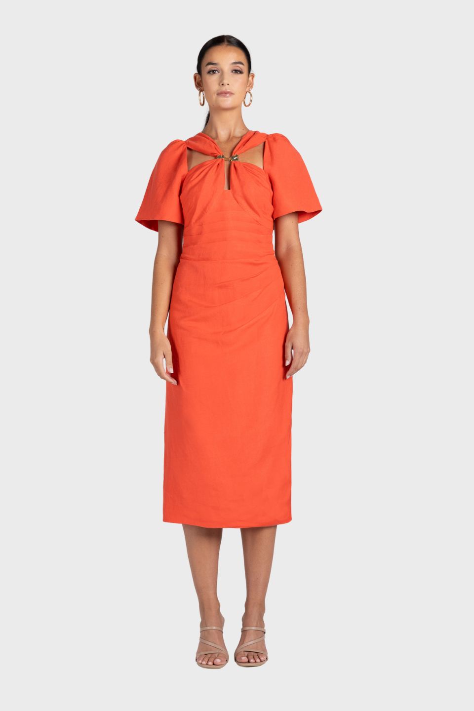 This draped midi dress features a sophisticated silhouette with subtle ruched detailing that enhances its elegant shape. The unique butterfly-shaped gold clip at the front adds a refined focal point, complemented by delicate slight puff sleeves. A discreet back zip ensures a smooth fit, making it perfect for stylish occasions where timeless grace is essential.