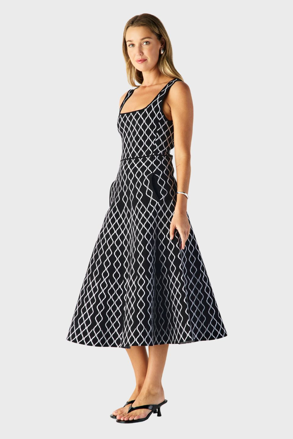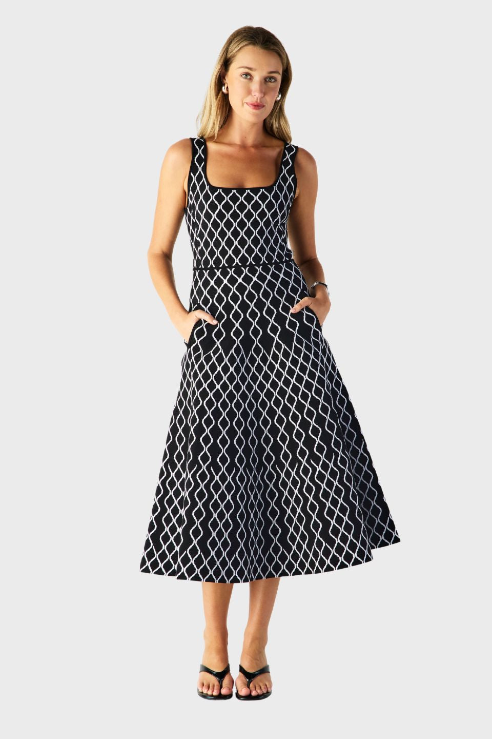 Lean into retro glam cues with the wardrobe-defining Tropea Knit Midi Dress. The skater-inspired silhouette is made from a woven stretch fabric with contrasting diamond intarsia detail to finish. Style the black colourway with white accessories for a bold, high-contrast finish.