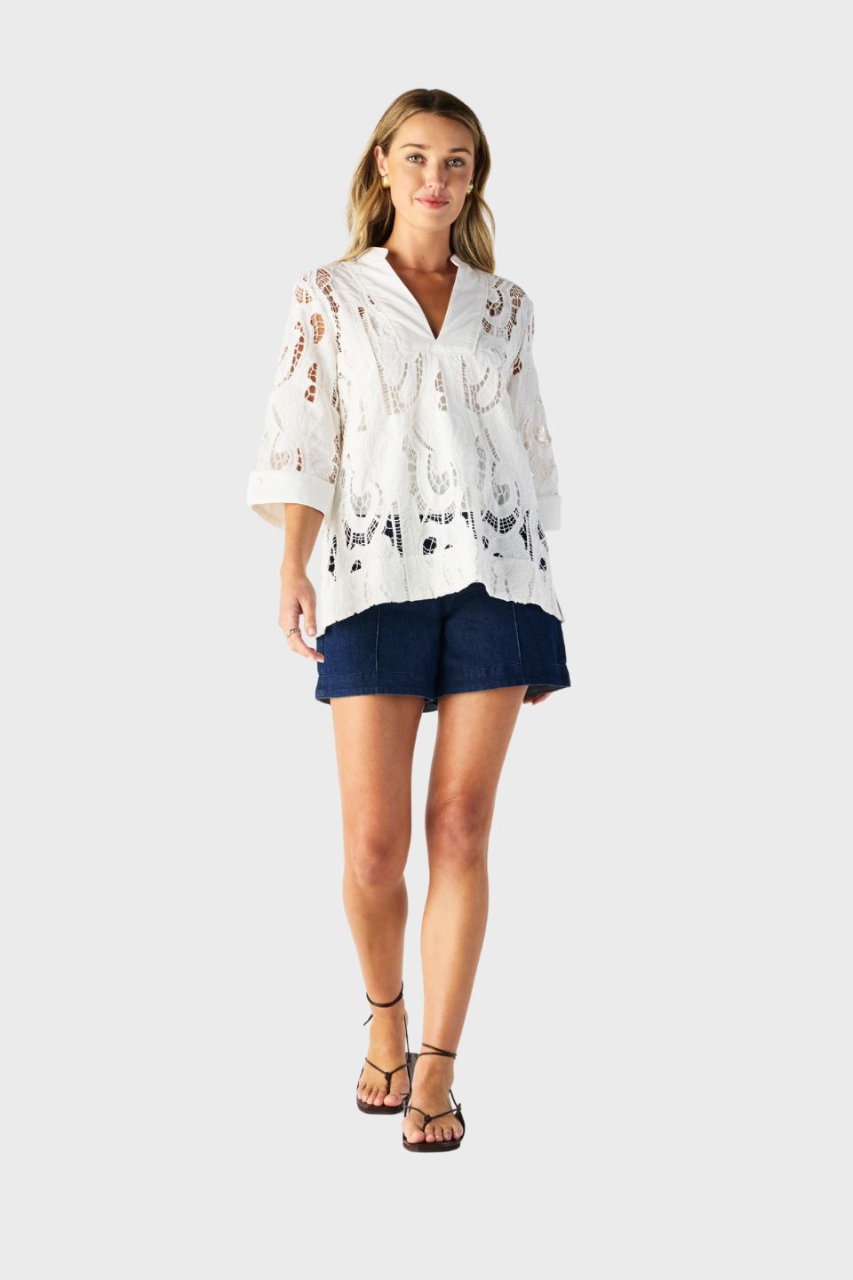The Marbella Tunic Top brings easy-wearing chic to summer capsule wardrobes. Cut from white or cornflower blue cotton and finished with embroidered details, it offers a boxy fit and features a V neckline, half-length sleeves and side split hems. Style with everyday denim and pared-back accessories.