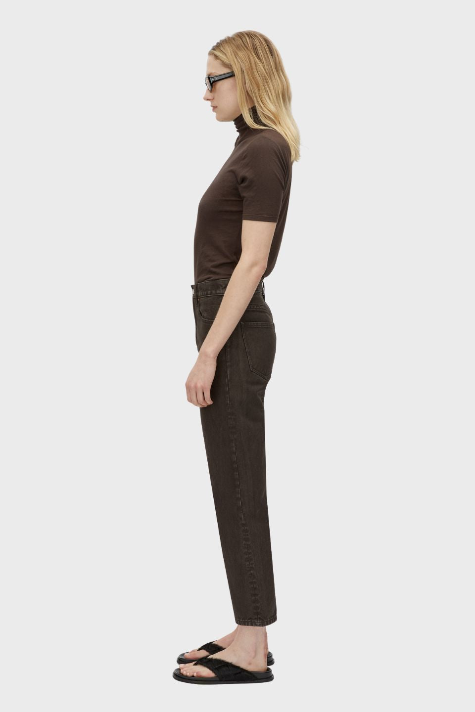 CAMILLA AND MARC Daria cropped straight leg denim jean in espresso brown. Mid-rise, classic five-pocket design, fly front button closure.