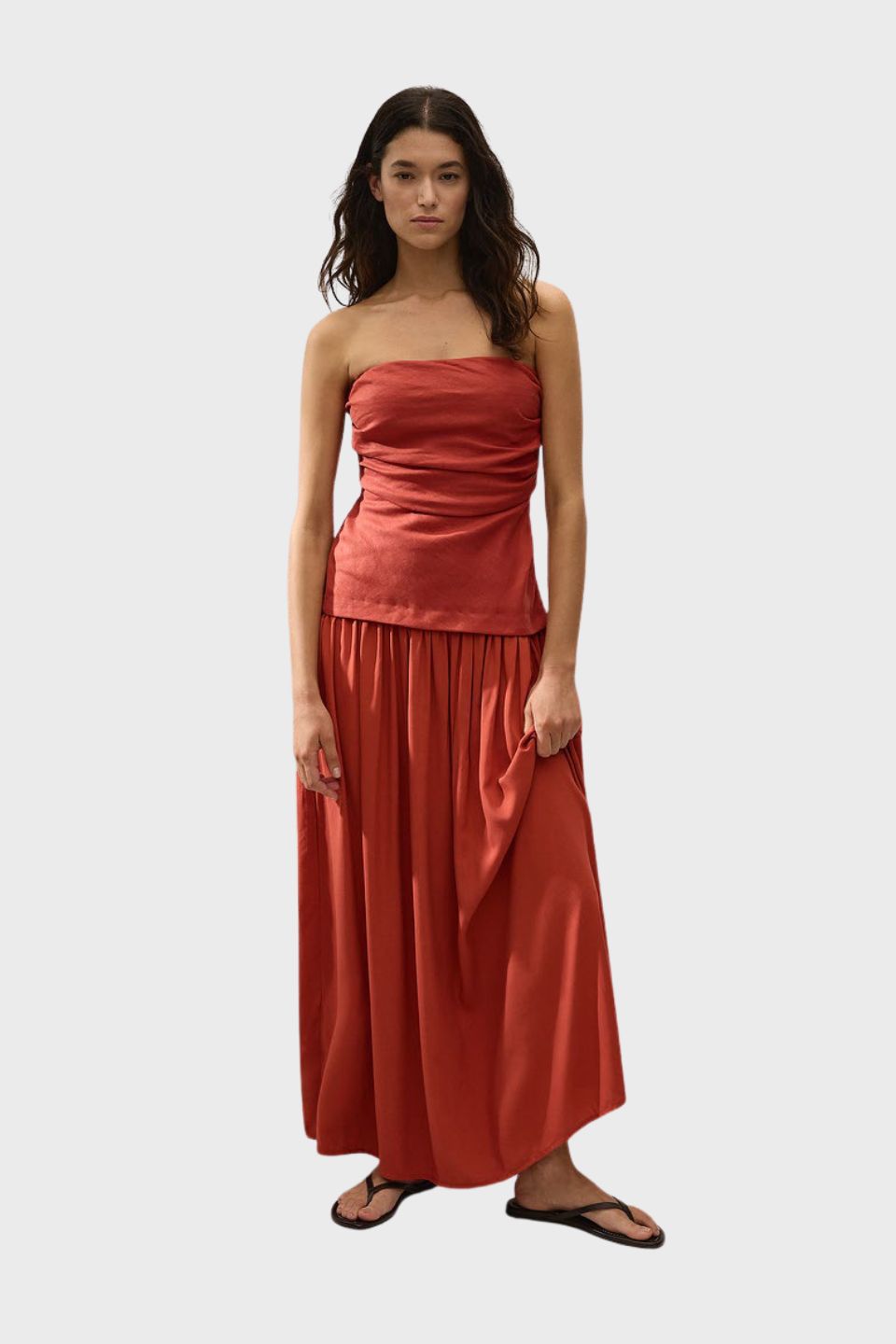 A new yet beloved FAITHFULL silhouette that continues in a new shade. A maxi dress with a fitted bodice designed from a signature 100% European Flax® linen fabrication, with gathered detailing across the front. It features a drop waist with a soft gathered skirt that flares into a slight A-line shape, cropping below the ankles. The skirt is designed from a rayon fabrication, offering a unique contrast to the bodice.