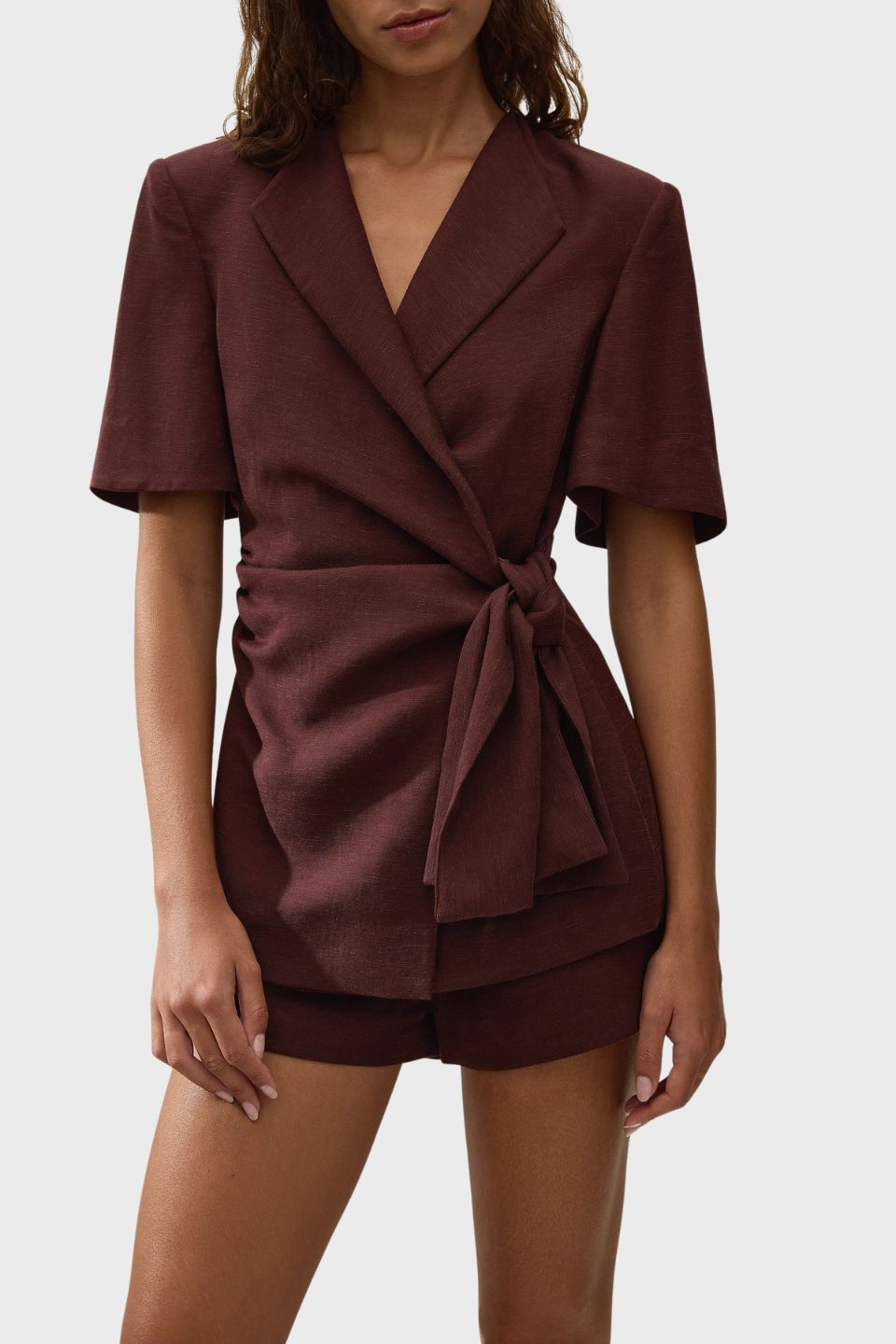 A wrap-style blazer, designed from a signature soft tailoring fabrication, blending viscose, Tencel, rayon and European Flax® linen, in a deep chestnut brown. Featuring a classic V-neckline with a lapel collar and wide elbow-length sleeves, it cinches in at the waist with subtle gathering. There is an adjustable yet relaxed tie detail at the waist as well as a curve hem that crops just below the hips.