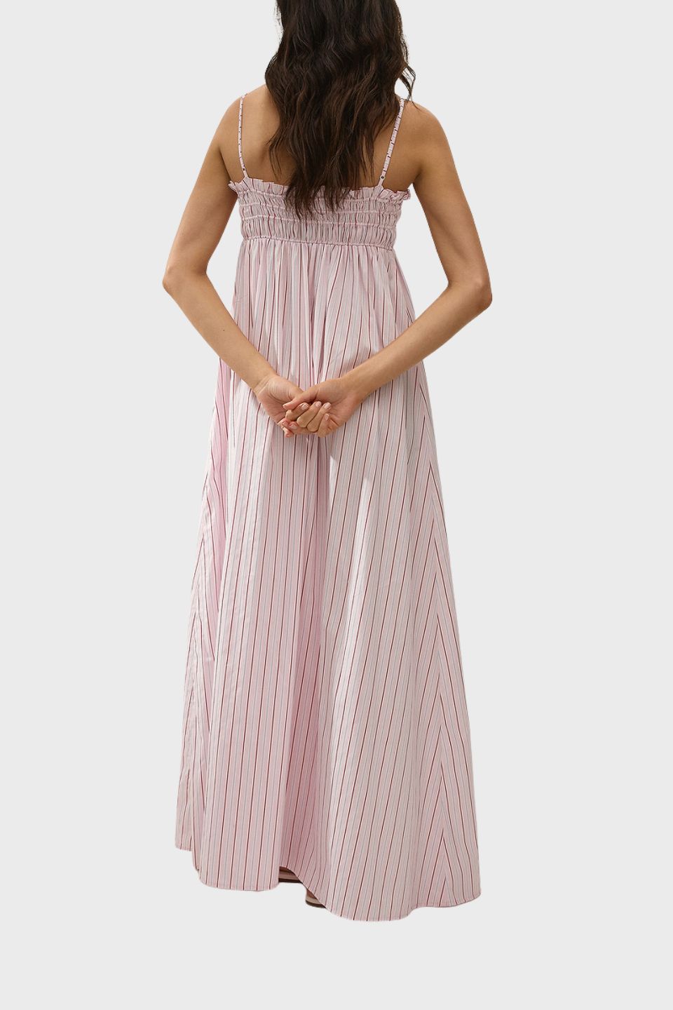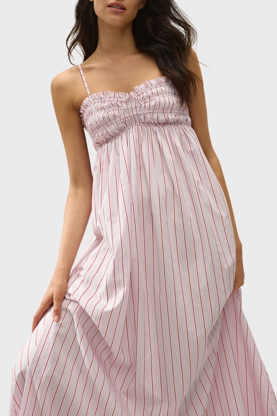 A vacation-inspired maxi dress, designed from a signature 100% BCI Certified organic cotton yarn-dyed in a vibrant fiori stripe palazzo. Ruched through the bust with a delicate frill detail along the neckline and thin straps, adjustable in length, it falls into a gathered empire waist with an A-line skirt. Lightweight with effortless appeal, style with a simple sandal for long sun-drenched days and balmy evenings.