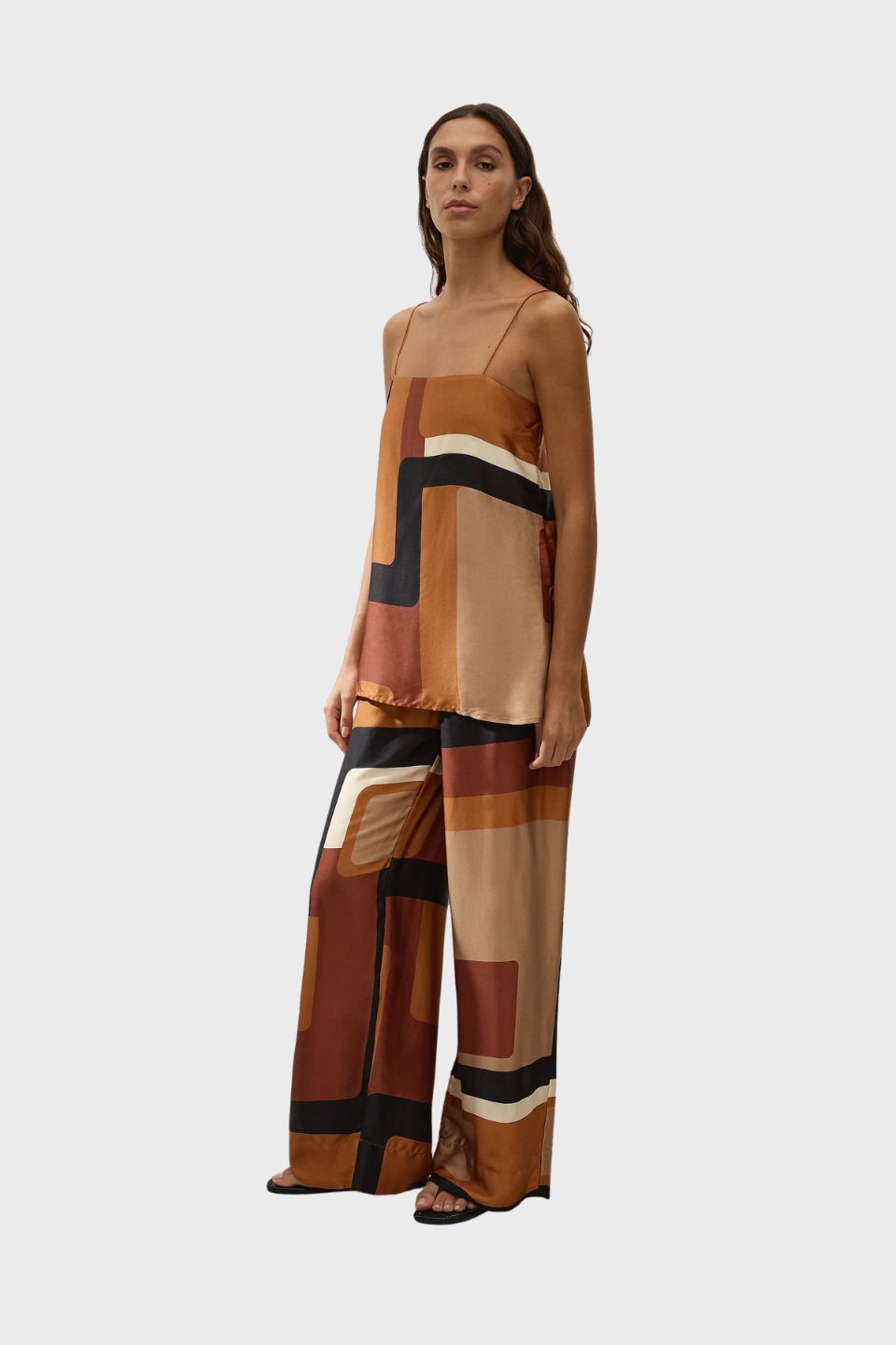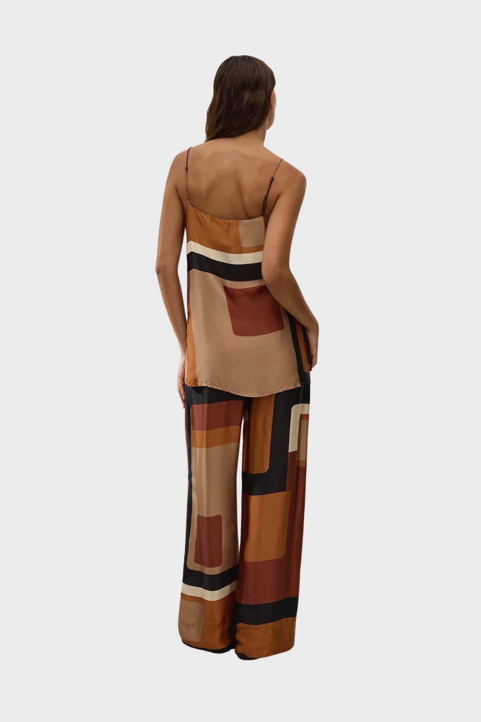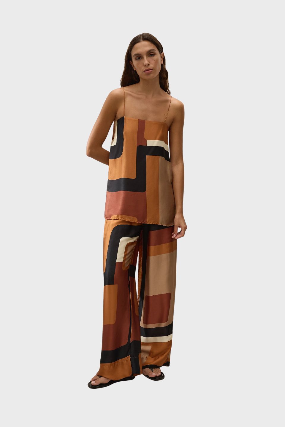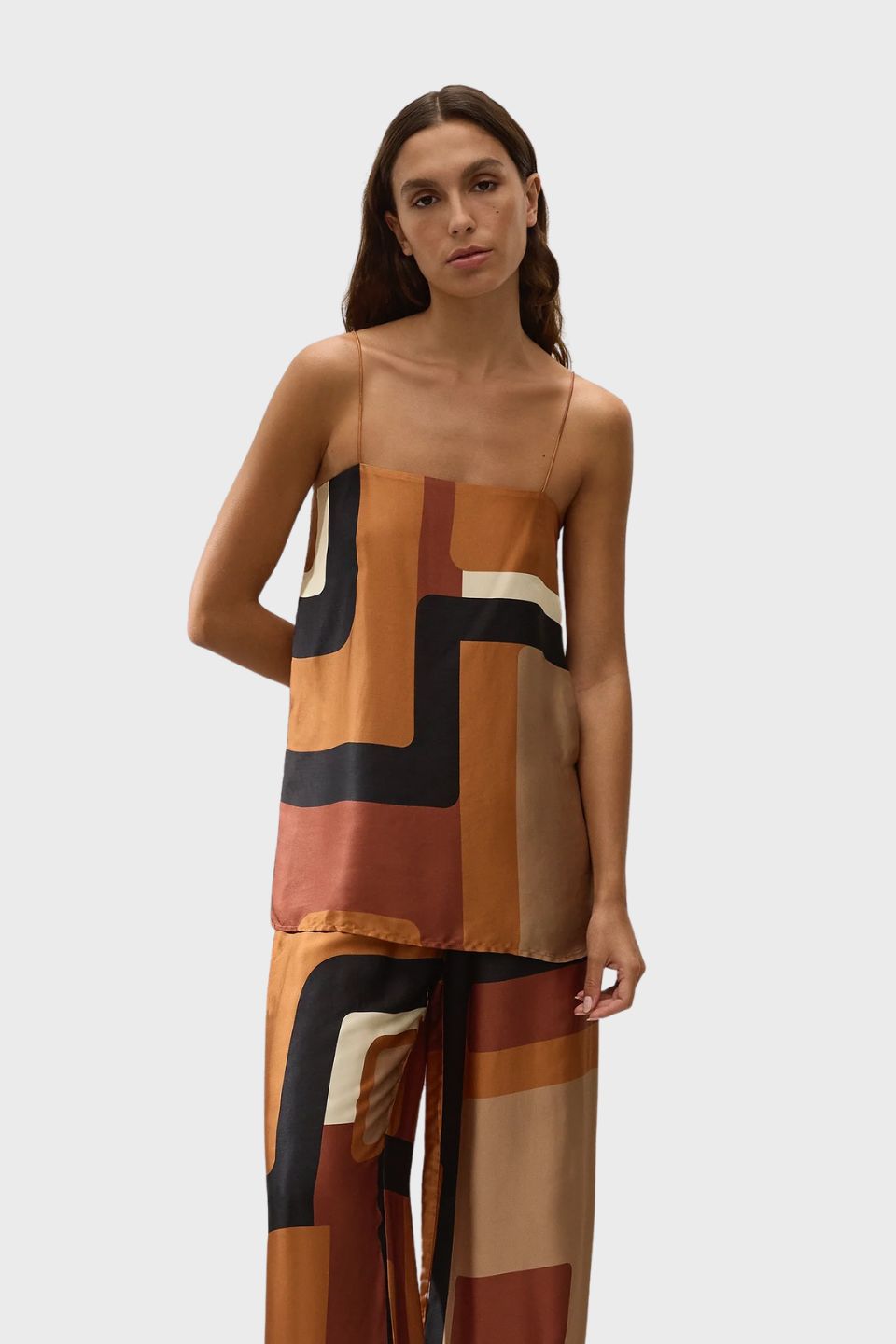 A 90s-inspired slip-style top, designed from a luxurious viscose satin fabrication, in a unique geometric print. Hanging effortlessly off the body in a straight silhouette, it features a straight neckline and thin adjustable straps as well as side seam splits. The hem is finished with a navy blue band. Style over the matching Jensen Pant for an elevated approach to everyday dressing.
