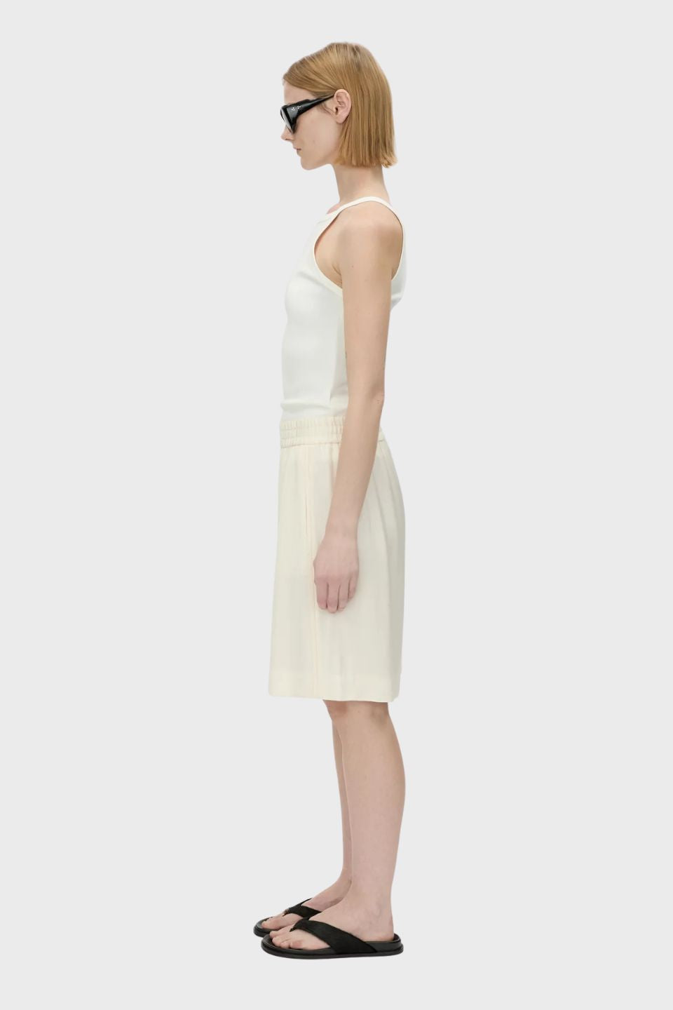 CAMILLA AND MARC Lazaro Bermuda cream short with external topstitch seam details. Pull-on design with elastic waistband and dropped crotch. Blind hem.