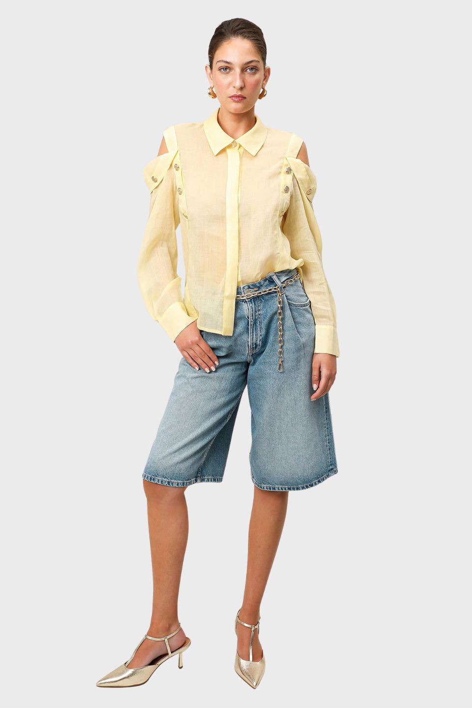 The Vivre Shirt embodies effortless sophistication through clean tailoring and thoughtful detailing. Crafted from breathable semi-sheer ramie, the silhouette is defined by a structured collar and a concealed placket. Gold feature buttons punctuate the design, fastening the collar and accenting the armhole introducing a subtle touch of polish. The shirt also features a sleeve cut-out detail, delicate paneling, and a slit at the back hem. This piece is a contemporary wardrobe staple designed with understated elegance.
